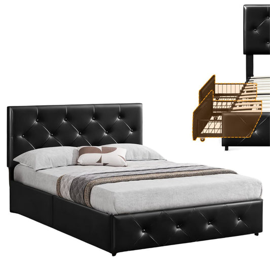 Upholstered bed with 4 storage drawers (140x200cm): Double bed frame with slatted frame | Black