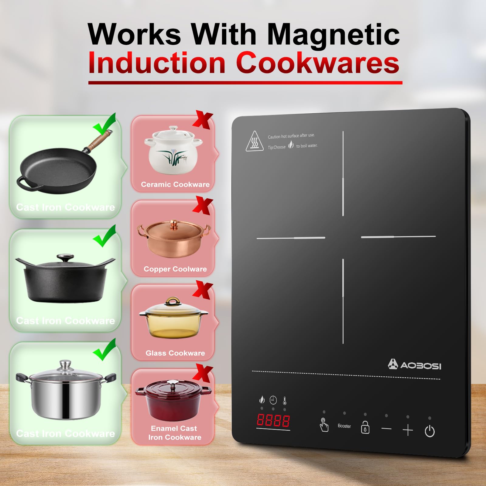 - 【Fully Functional】 6 touch buttons for all your needs. The Aobosi induction cooktop features temperature and power adjustment, a 10-hour timer, child lock, and a booster function. The booster function heats up quickly at maximum power and returns to its original state after 10 minutes of heating. This is ideal for quickly fried foods.