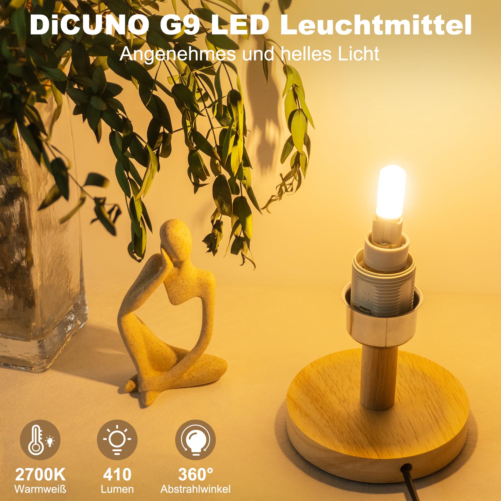 The DiCUNO G9 LED bulb in warm white 2700K offers 410 lumens and a 360° beam angle , providing pleasant light that replaces a 40W halogen bulb . It saves up to 92.5% energy and boasts a long lifespan of 25,000 hours .