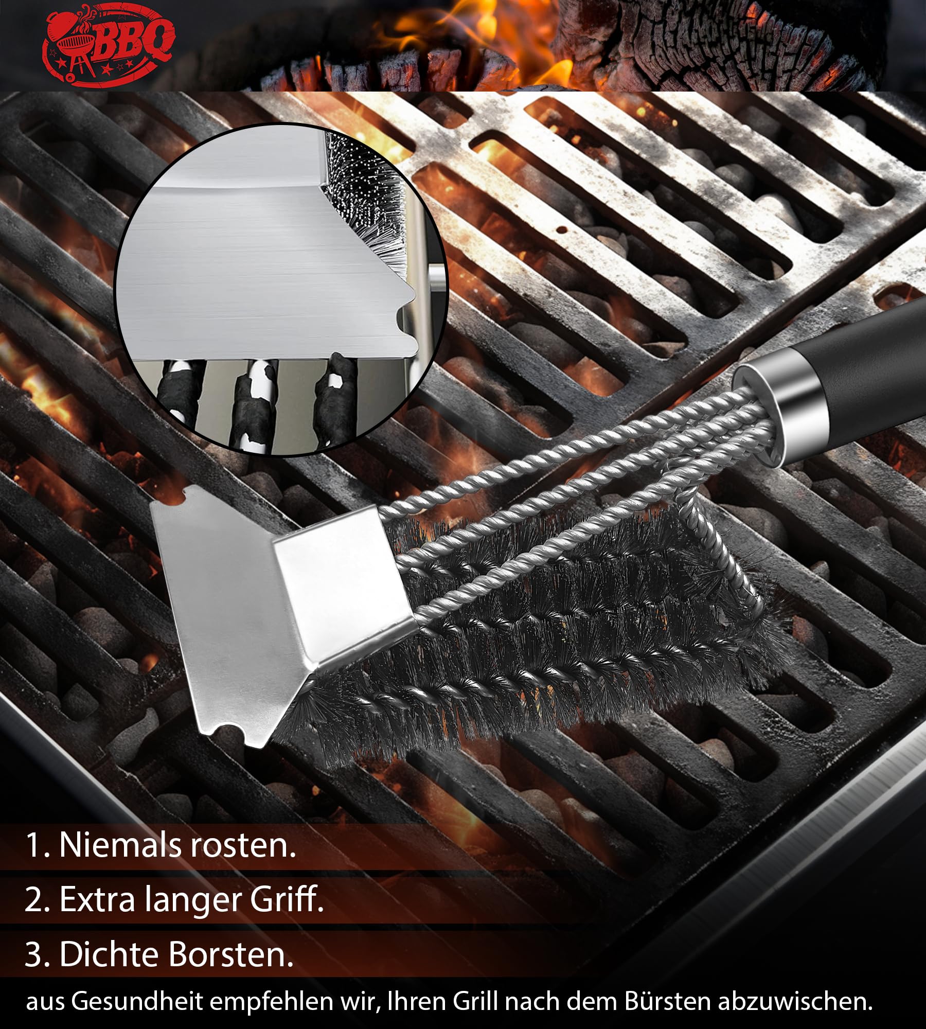 - 【3-IN-1 BRUSH WITH SCRAPER】 - Still stuck in the debris stuck to your favorite grill? No matter how much detergent you use, you can't clean your grill well with your grill brush? You're just using the wrong tool! This grill brush with an extra-sharp stainless steel scraper can easily scrub away stubborn dirt with a little effort. Save time and effort, let's just have fun.