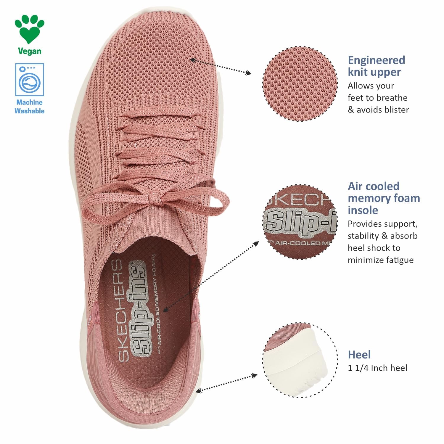 The women's Ultra Flex 3.0 Brilliant Path sneaker features a stretch-fit design for sock-like comfort. A cushioned memory foam insole provides comfortable cushioning with every step.