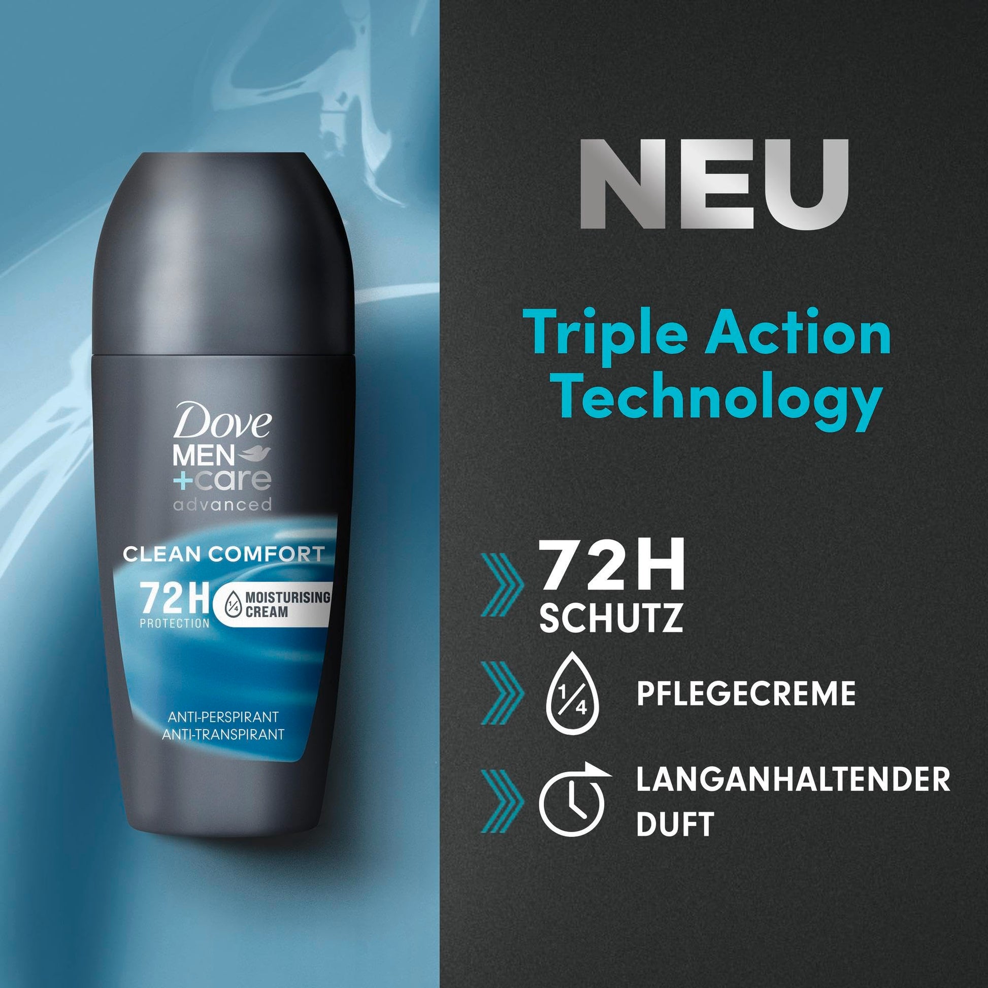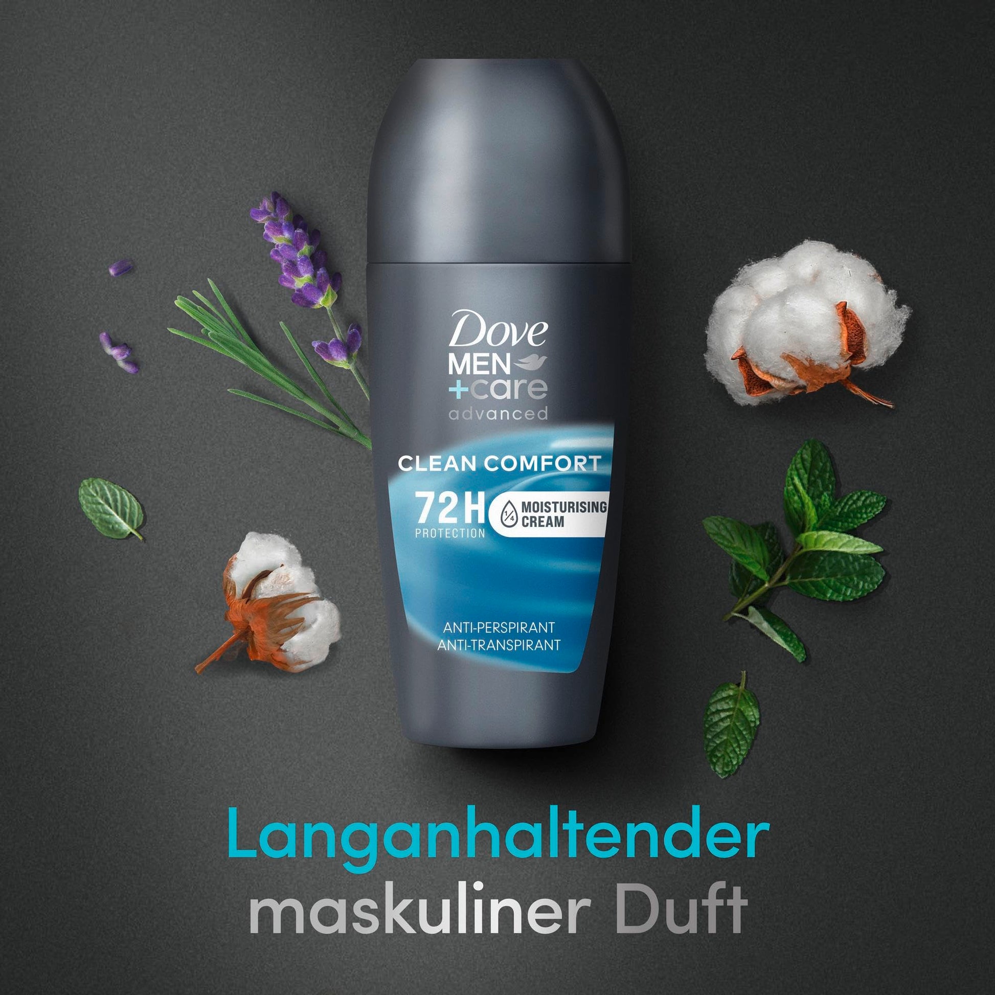 Der Dove MEN+care Advanced Anti-Transpirant Deo Roll-On Clean Comfort bietet zuverlässigen Schutz vor Körpergeruch und Achselnässe für bis zu 72 Stunden. Mit seiner einzigartigen Formel, die ¼ Pflegecreme enthält, schützt er die empfindliche Haut unter den Achseln vor Irritationen und fördert die Regeneration, besonders nach häufigem Rasieren. Das Deo verwöhnt mit einem dezente, männlichen Duft und sorgt für ein angenehmes Frischegefühl.