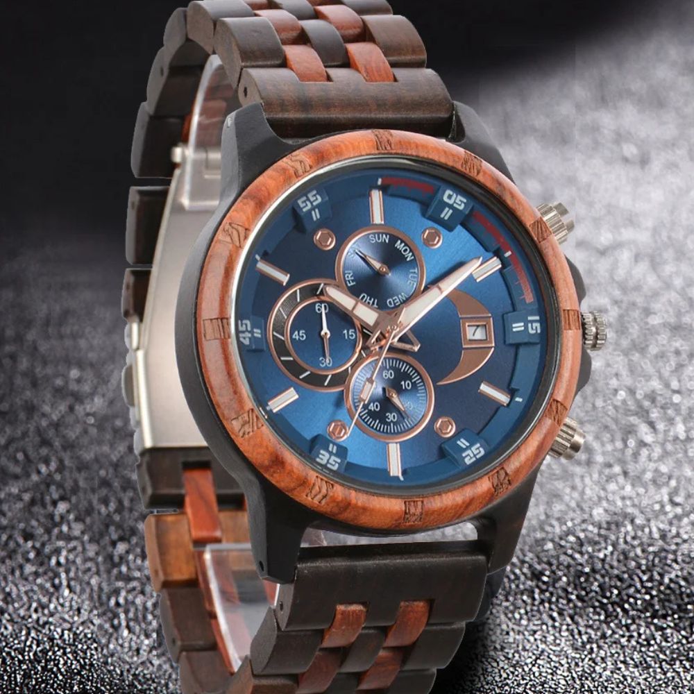 Edle Holzuhr für Herren | Personalisiert & Graviert (Optional), Perfektes GeschenkBequem & Sicher: Der zweifarbige Holzarmband-Design bietet Komfort und Stil zugleich. Die Edelstahl-Schließe sorgt für sicheren Halt und Langlebigkeit.