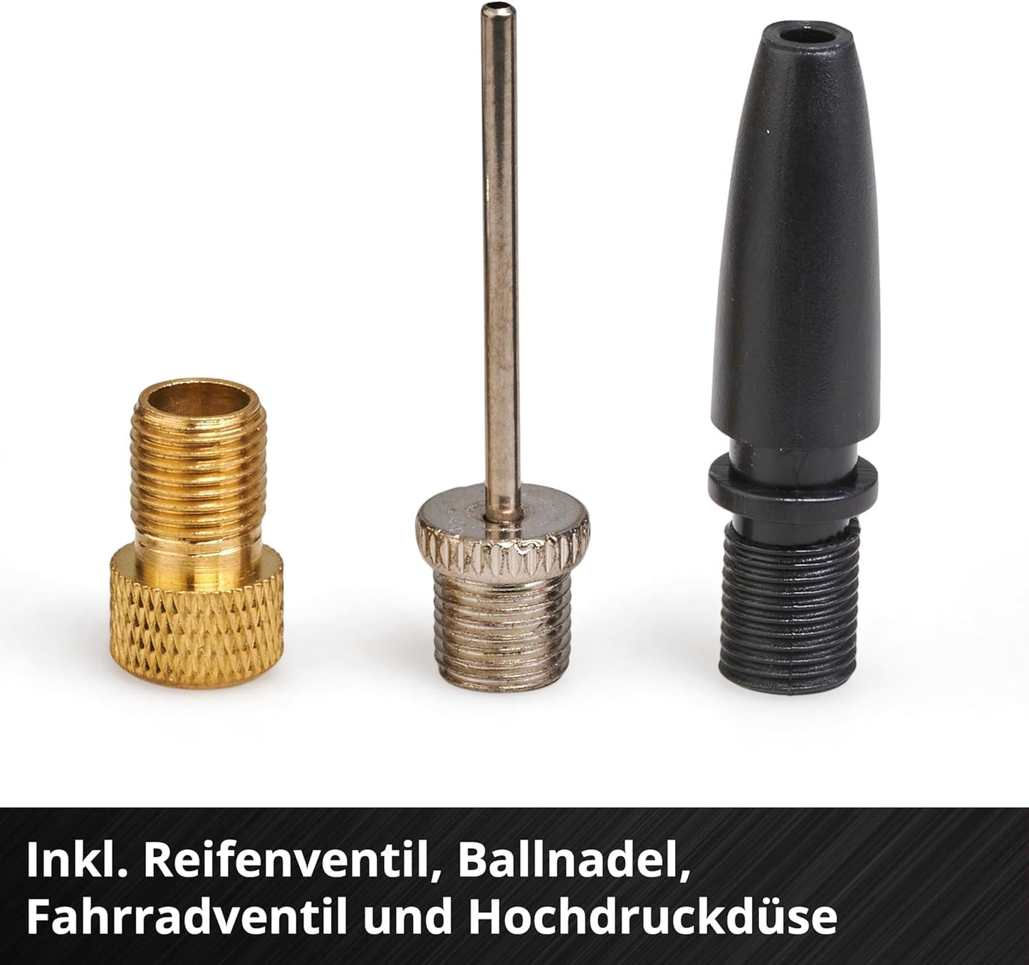 Inkl. Ballnadel, Fahrradventil und Hochdruckdüse, alles direkt am Gerät verstaubar.