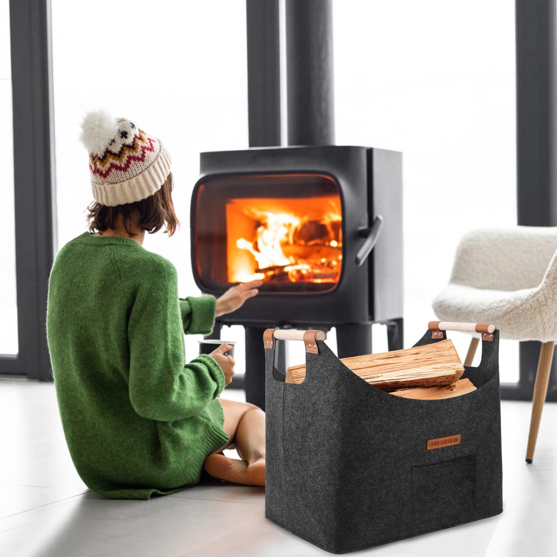 XL Brennholz-Filzkorb mit verstärkter Griff für Einkauf, Holz, Zeitung oder Brennholz
