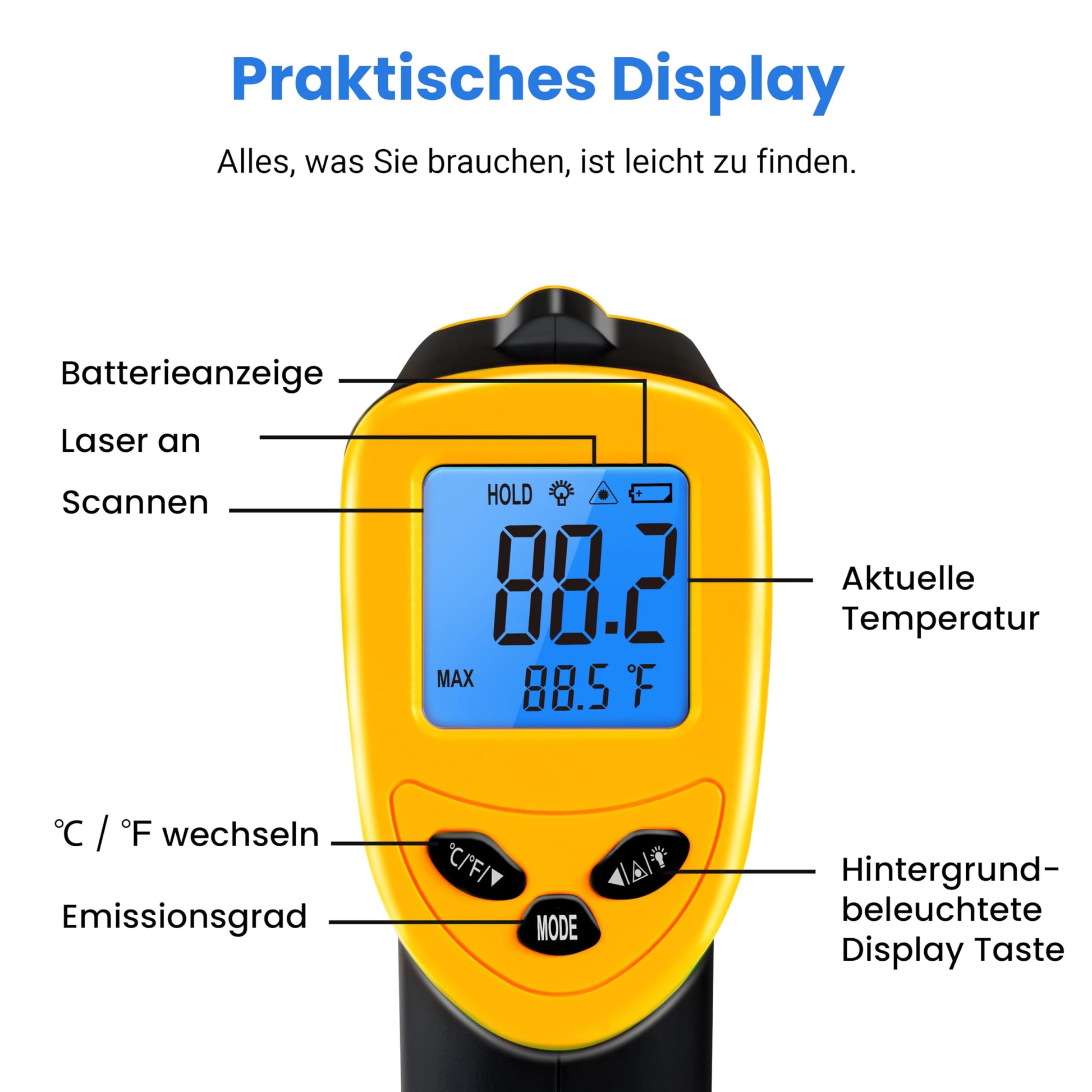 Praktische Extras: Hintergrundbeleuchtetes LCD, Umschaltbar °C/°F, Auto-Off & Batterieanzeige