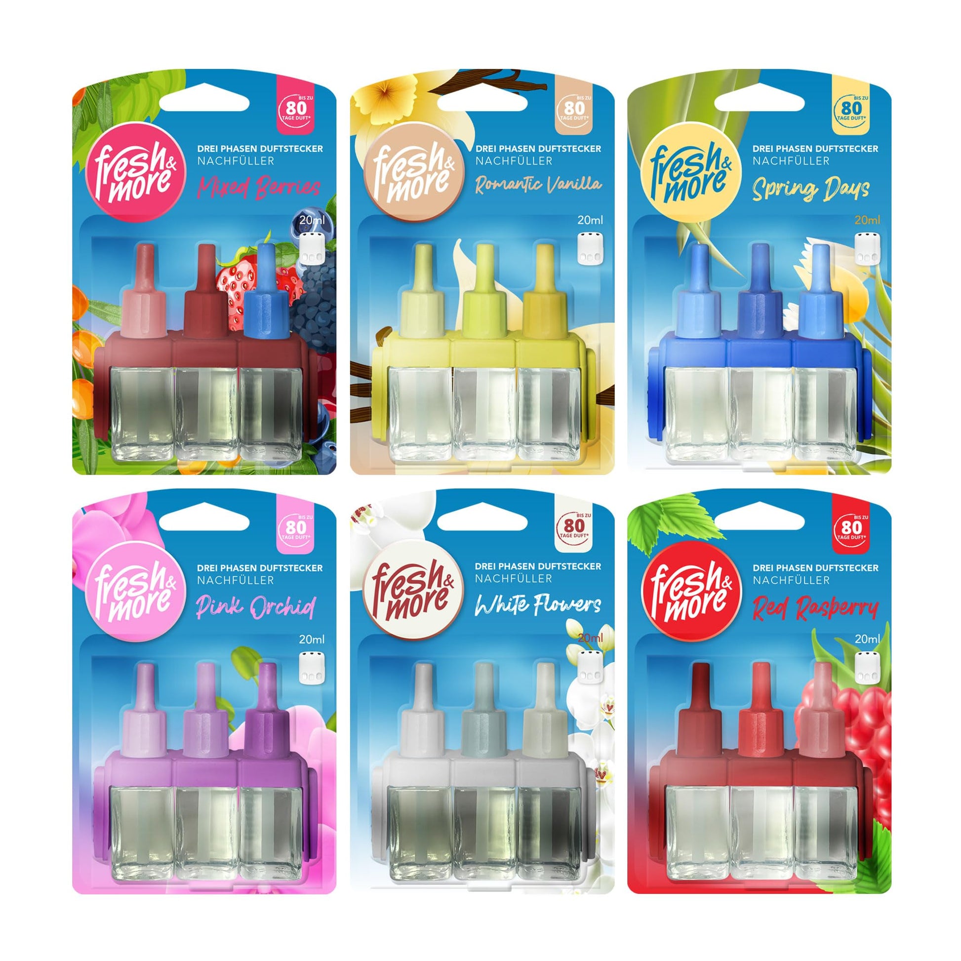 Erleben Sie abwechslungsreiche Frische in Ihrem Zuhause: Mit den fresh & more Nachfüllflakons sorgen Sie für dauerhafte Duftvielfalt und eine angenehme Atmosphäre in jedem Raum.