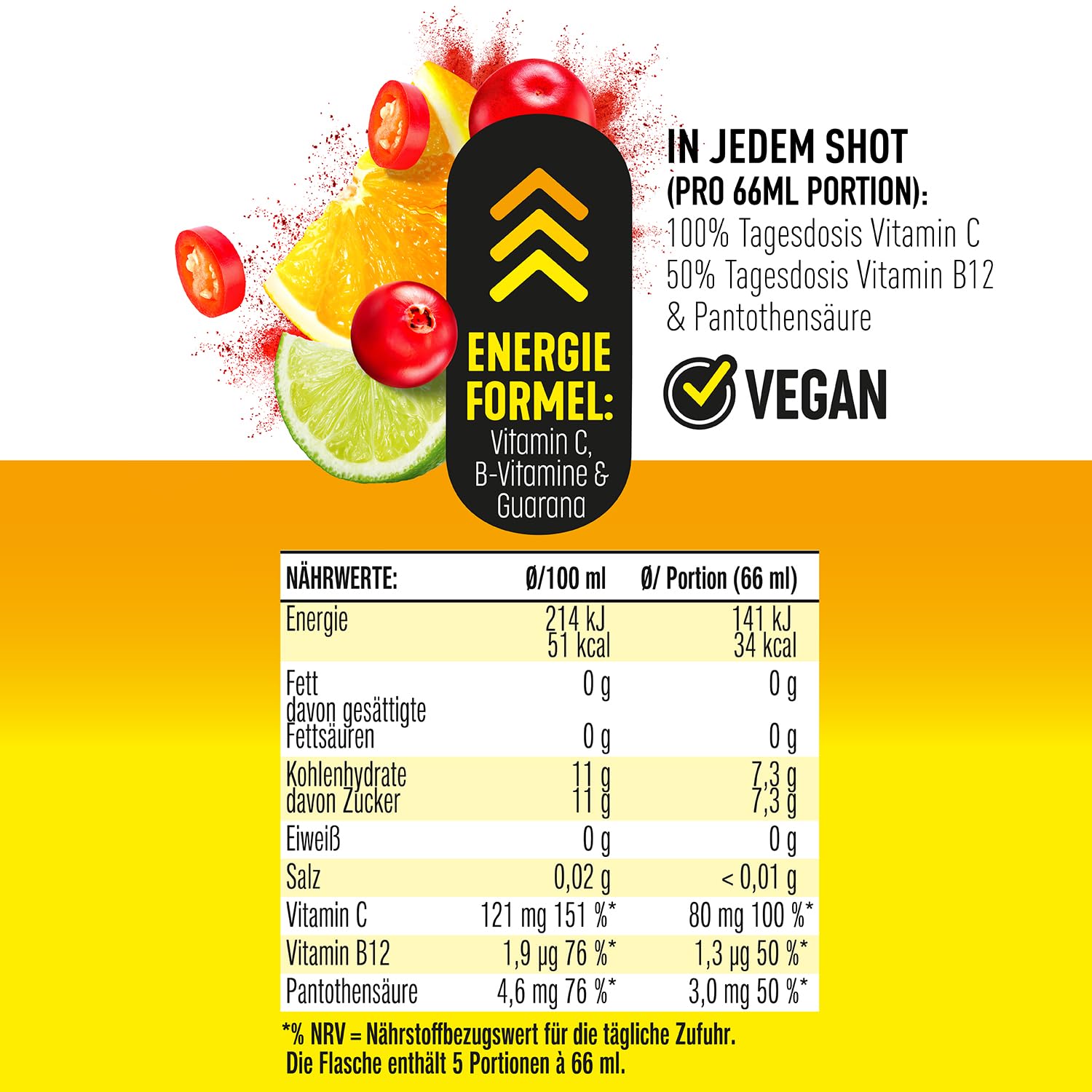 Mit einer Mischung aus Orange, Cranberry und Guarana-Extrakt bieten diese Shots nicht nur einen außergewöhnlichen Geschmack, sondern versorgen deinen Körper mit 100% Vitamin C, 50% Vitamin B12 und Pantothensäure pro Portion.