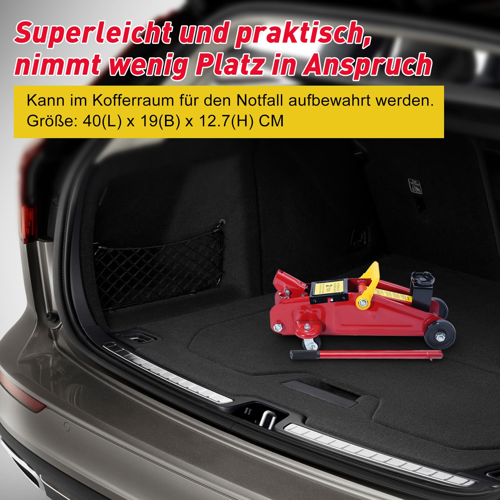 Ideal für Kleinwagen: Hebekapazität bis 1,5 Tonnen (2,0 t statisch) - kompakt, leicht und kofferraumgeeignet.