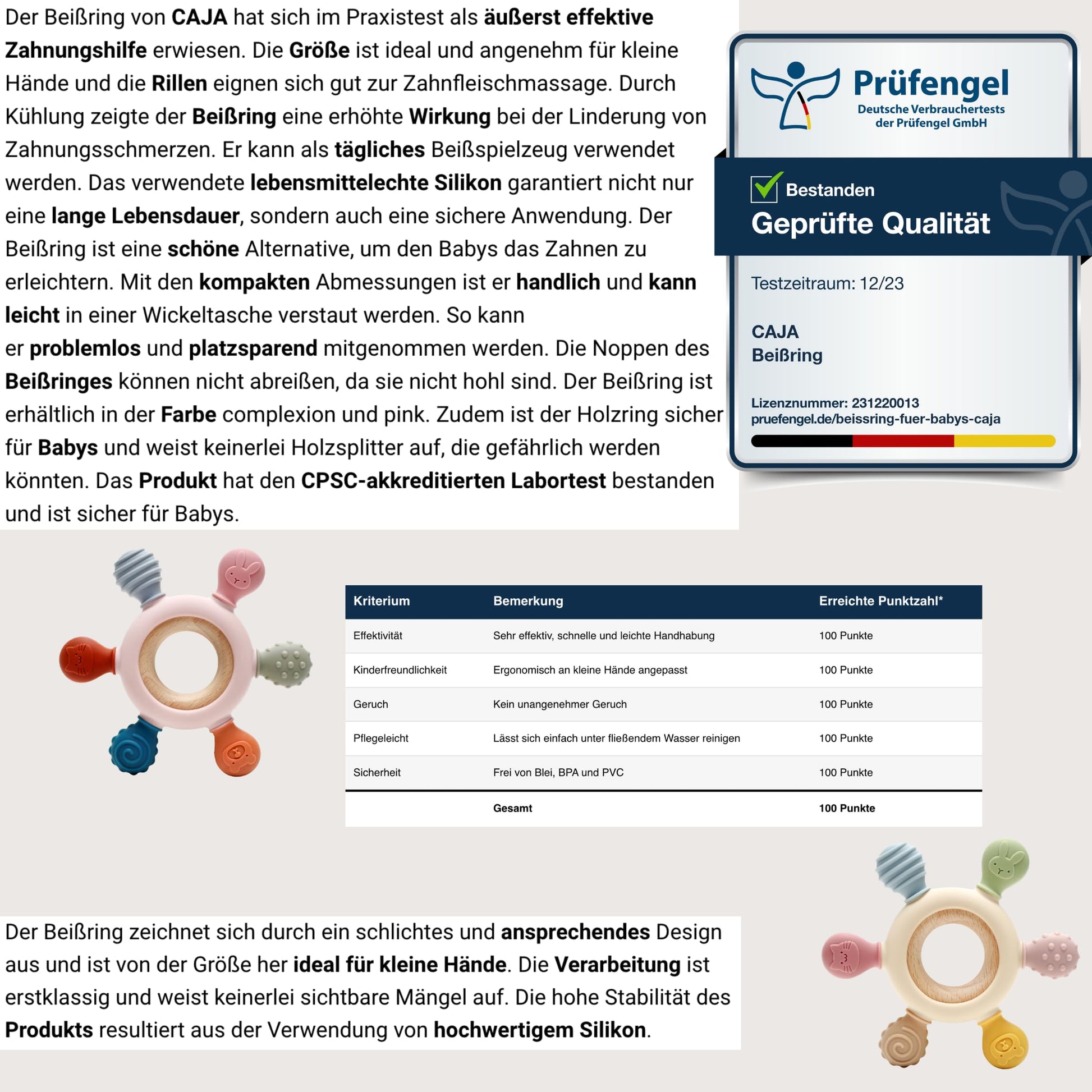 Der CAJA Baby Beißring besteht aus 100% lebensmittelechtem, BPA-freiem Silikon und erfüllt alle EU-Sicherheitsstandards. Mit seiner strukturierten Oberfläche lindert er effektiv Zahnungsschmerzen und fördert gleichzeitig die sensorische Entwicklung deines Babys. Das handliche Design ist ideal für kleine Hände und eignet sich perfekt für unterwegs.