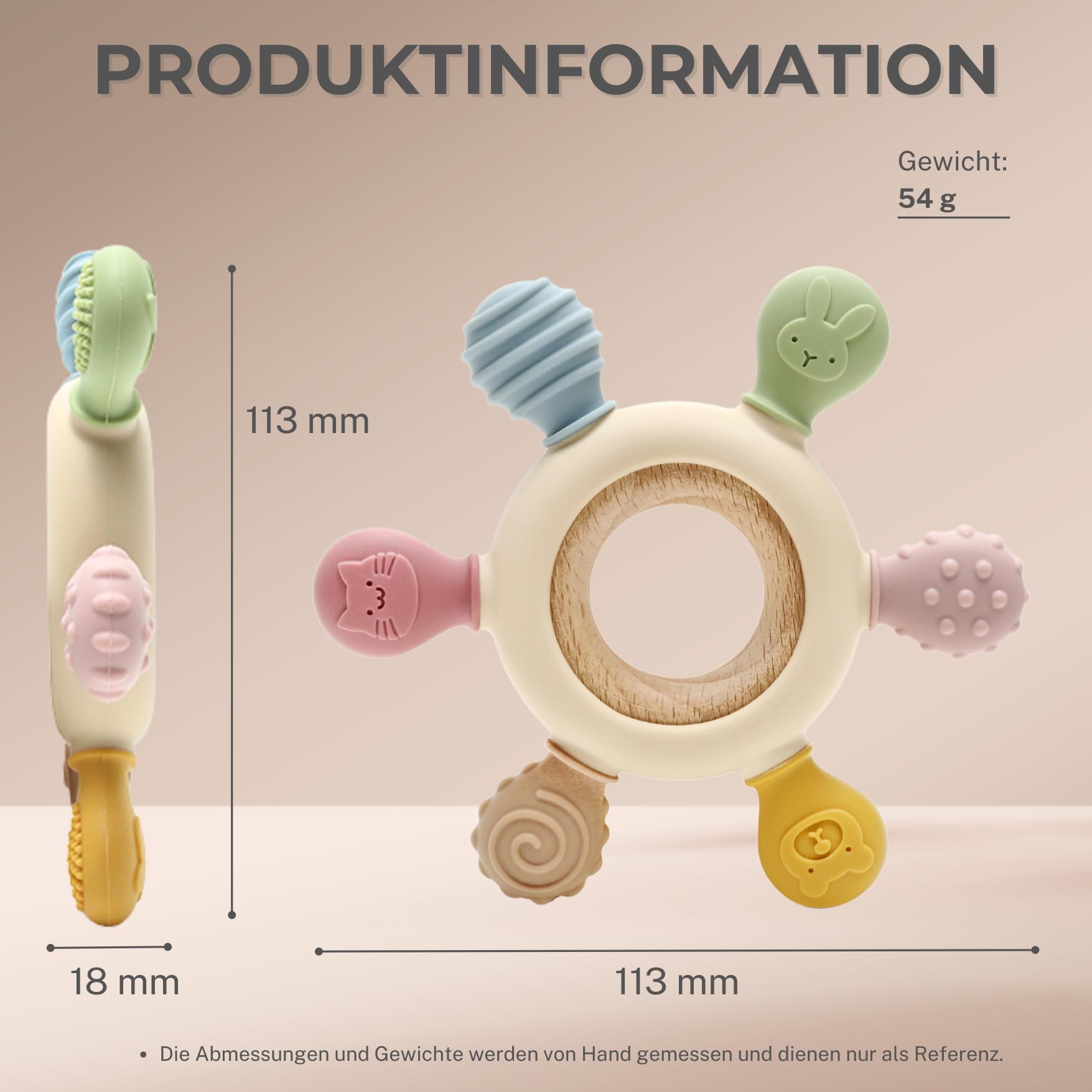 Dank der robusten Materialqualität ist der Beißring spülmaschinenfest, kann gekühlt oder sterilisiert werden und bleibt so hygienisch sauber. Das niedliche Tierdesign macht das Zahnen angenehmer und ist ein schönes Geschenk zur Geburt, Babyparty oder zum Geburtstag.