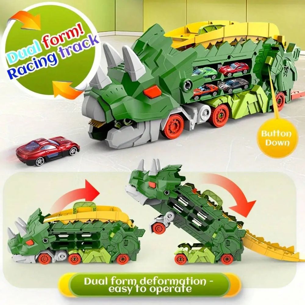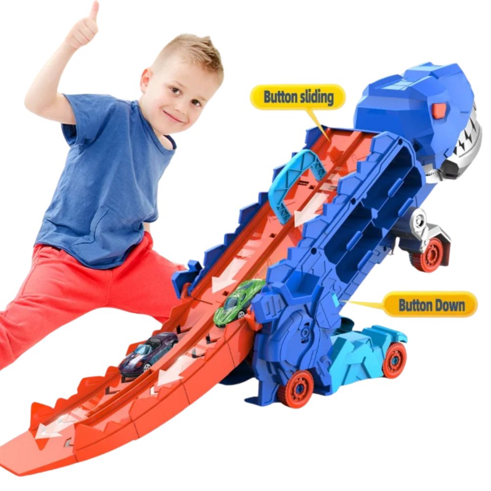 Erleben Sie das ultimative Spielerlebnis mit dem Dinosaurier-Transporter Schiebe-Rennbahn-Set, das sich nahtlos von einem coolen Transportwagen in einen stehenden Dino verwandelt. Perfekt für Kinder, die Abenteuer, Rennen und Dinosaurier lieben!