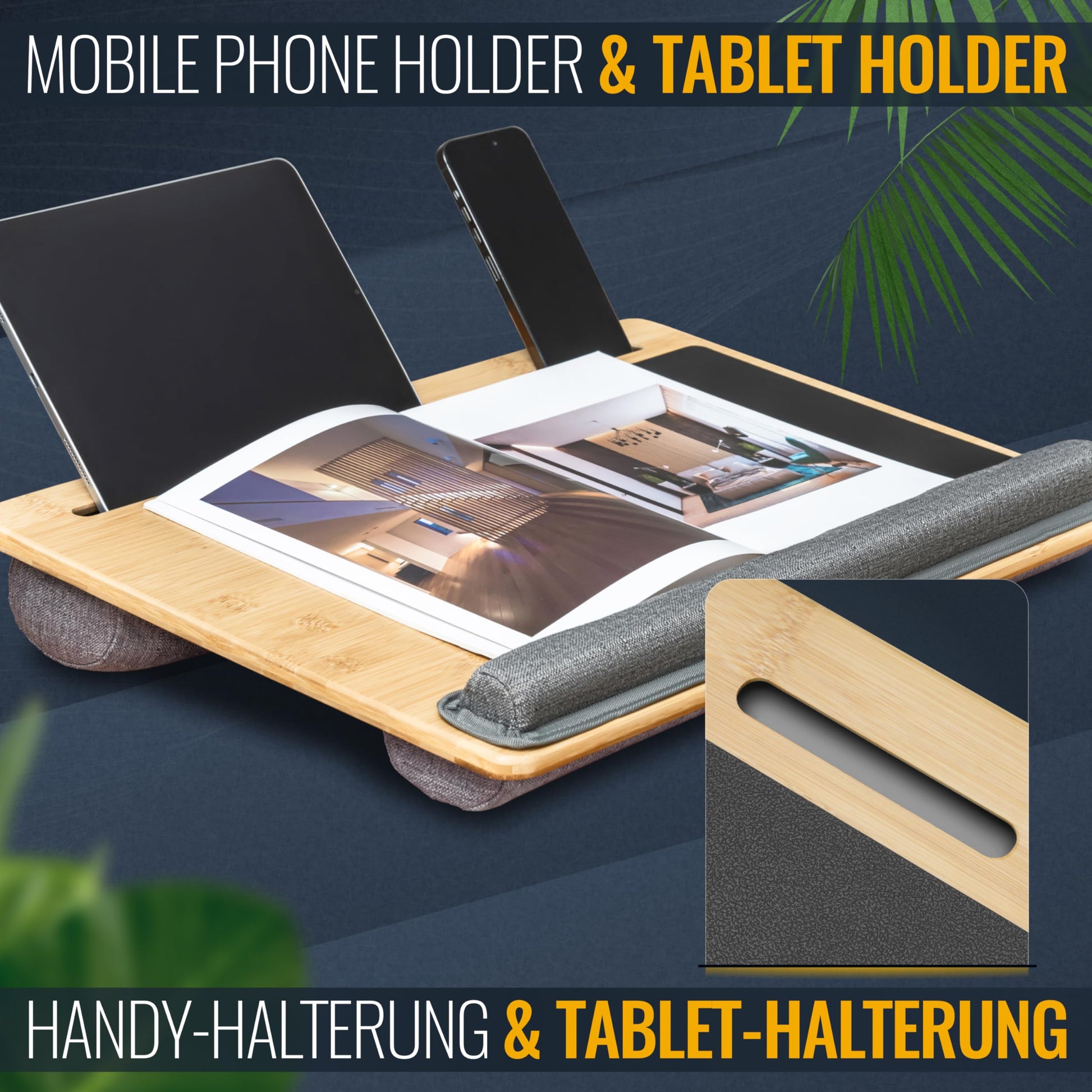 - BESCHREIBUNG: Praktischer Laptop Stand mit Handyhalterung und Tablet Halter. Die Laptop Unterlage bietet optimalen Komfort fürs Arbeiten im Home Office, im Bett, Sofa oder Sessel.